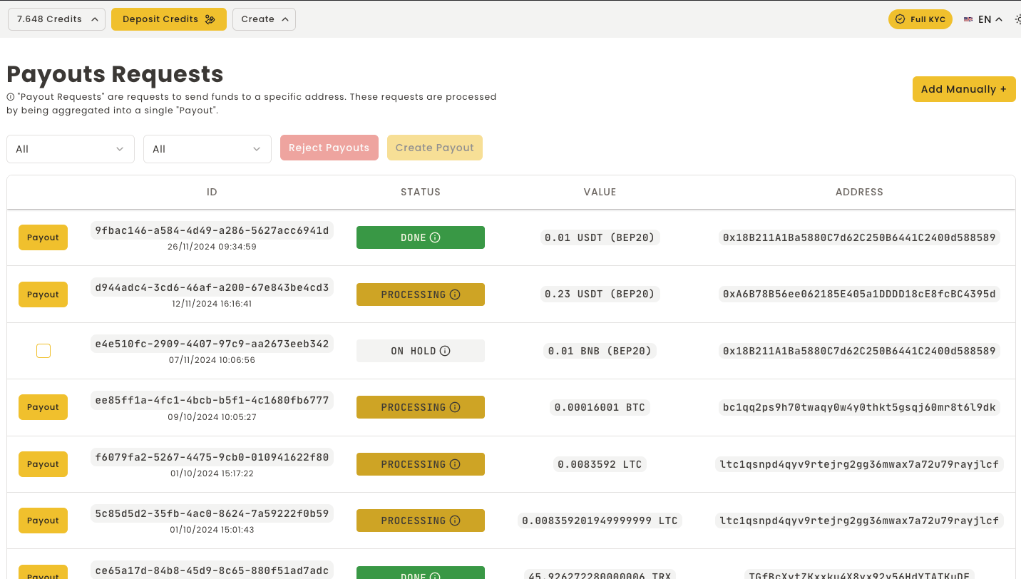 Important: All selected payout requests must be for the same cryptocurrency. You cannot mix different cryptocurrencies in a single payout transaction.
