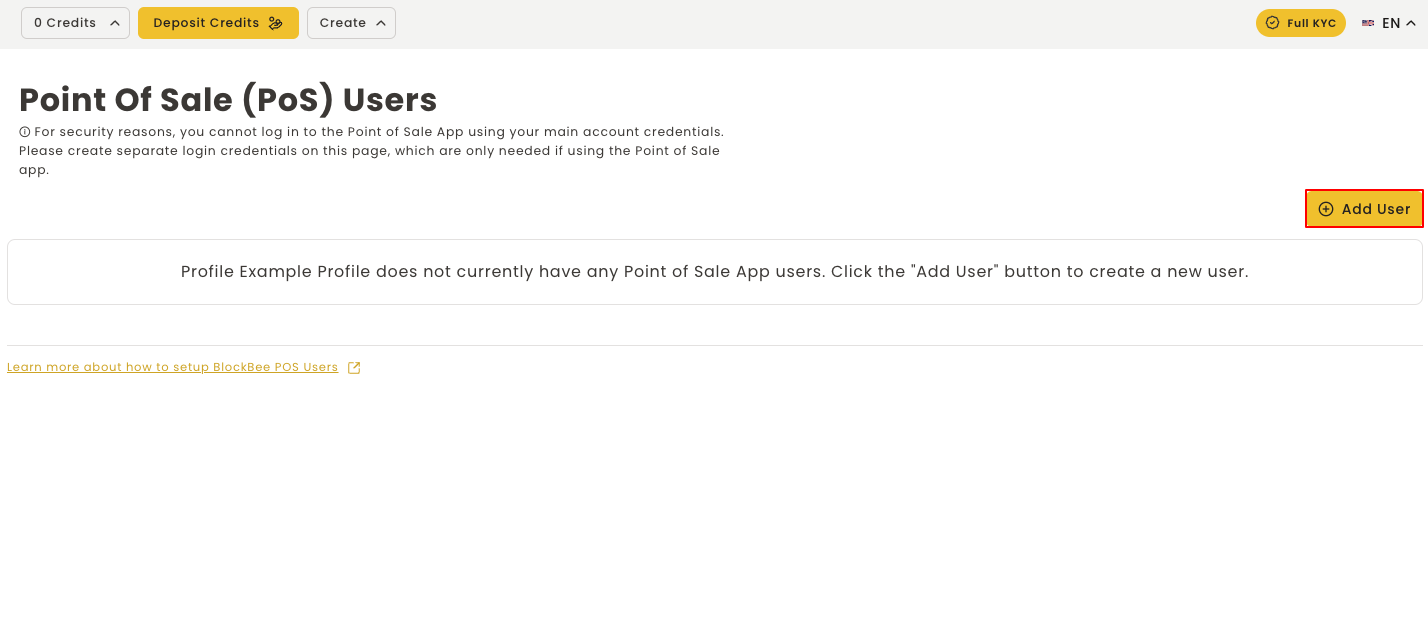 Before creating a POS user, ensure you have created a Profile and selected it in your dashboard.