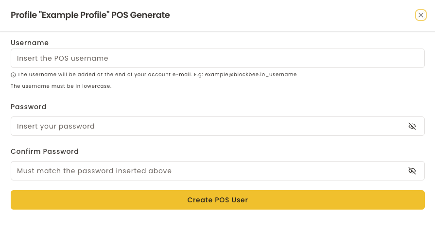 Your POS user is now created! Employees can use the generated credentials (email with username suffix and password) to log into the BlockBee POS App without accessing your main account.