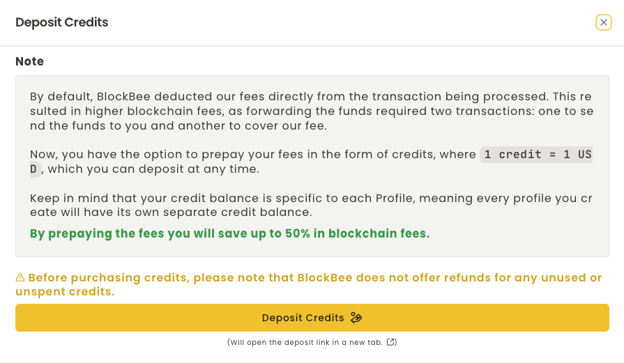 - Flexible and Profile-Specific Credit Deposits: Credits can be deposited anytime and are tied to specific Profiles in your BlockBee account