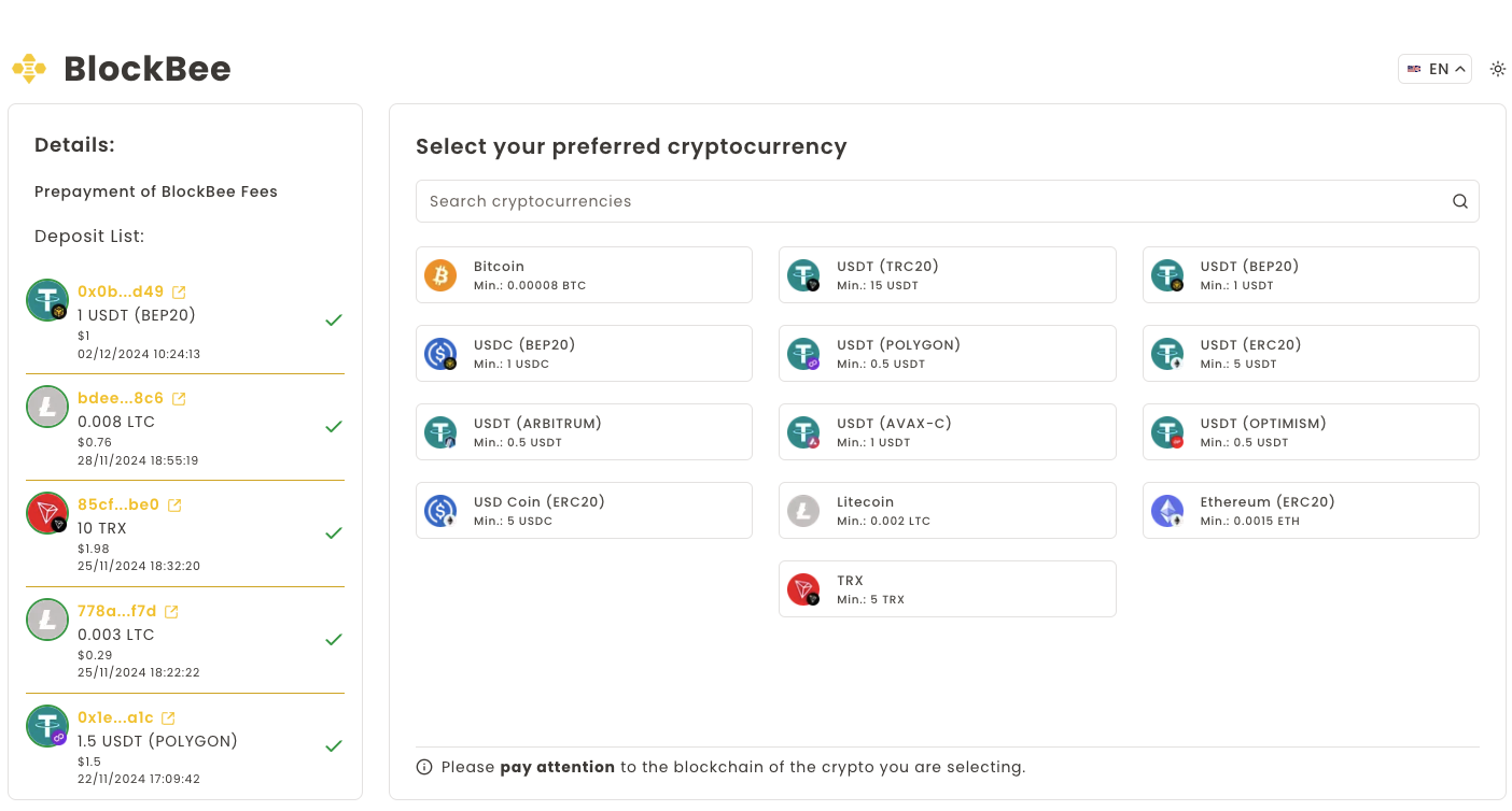 - BlockBee's service fee is covered by your prepaid balance