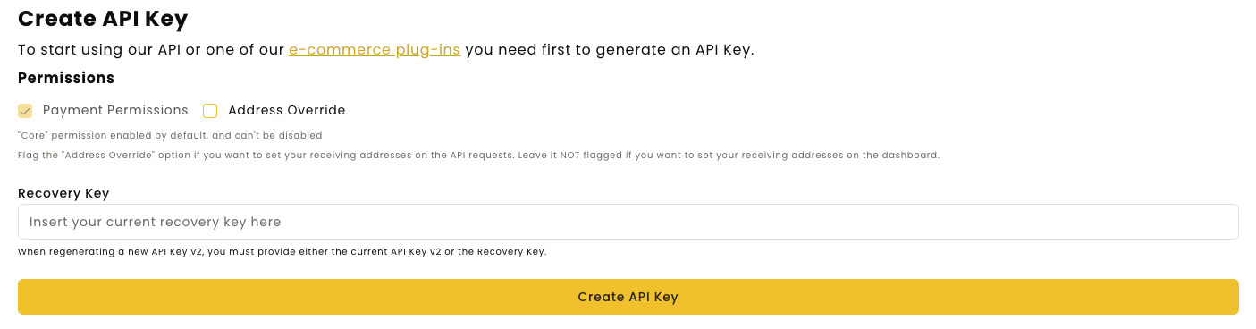 Creating an API Key is rather simple. You just need to select the permissions you wish to enable. Right now we only have one, which is Address Override, which allows you to set your wallet address right in the API request using the address parameter. If you don't wish to do this, you may leave it disabled.