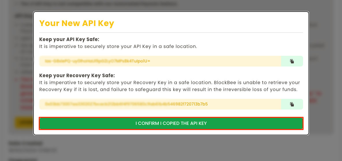 After storing the keys securely you will need to click I confirm I copied the API Key.