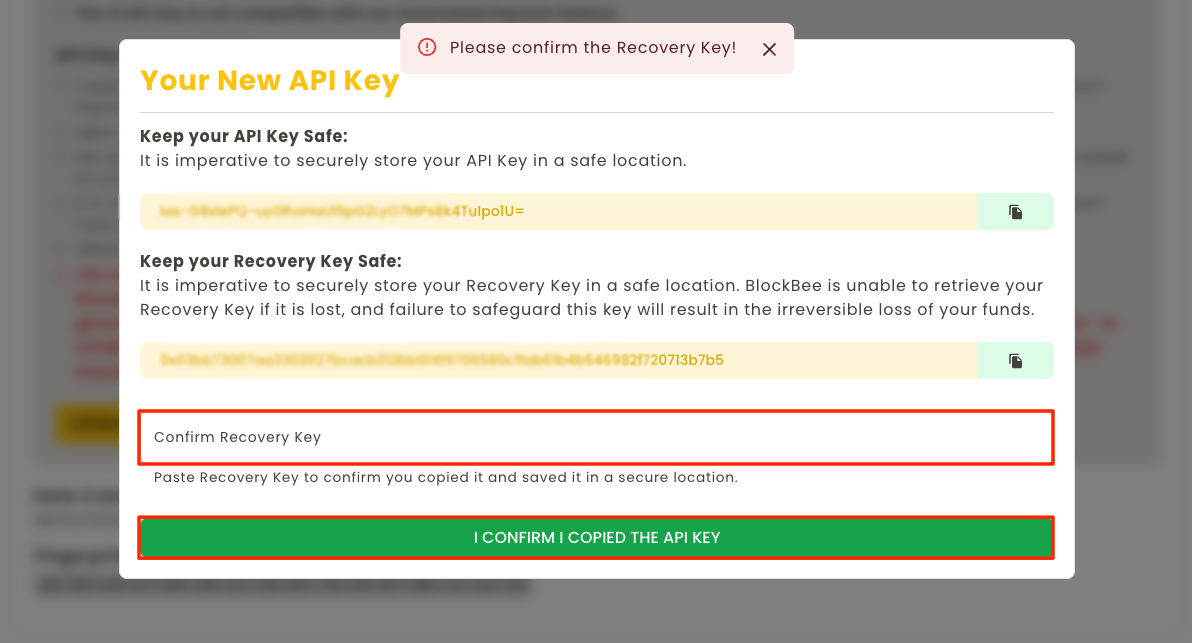 Remember: Store your API Key V2 and Recovery Key in separate, secure locations. Consider using a password manager or secure vault for storage.